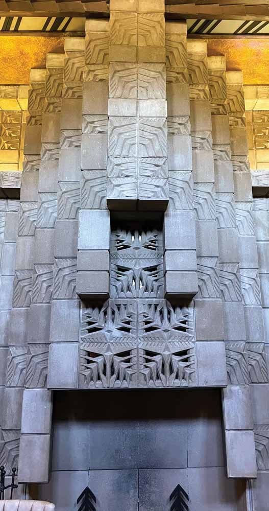 “During Prohibition, a spotlight operator on the roof would shine light into the skylight to warn of approaching police,” Johnson explains while demonstrating how a sliding bookcase hid the bar. The room’s fireplace, meanwhile, provides a towering example of the 250,000-plus handmade concrete blocks, featuring 24 geometric patterns that adorn and support the 705-room Biltmore.