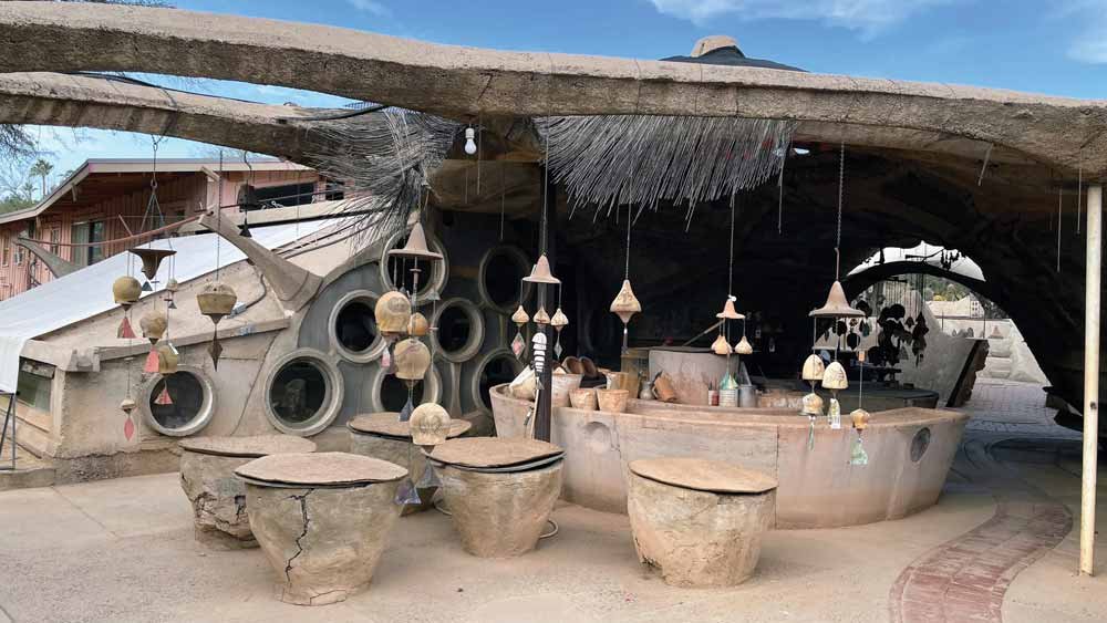 Our “Art and Architecture” tour proceeds to Cosanti Originals, the former studio and residence of visionary architect and Wright apprentice Paolo Soleri, where we admire handcrafted bronze bells and experimental earth-formed concrete structures.