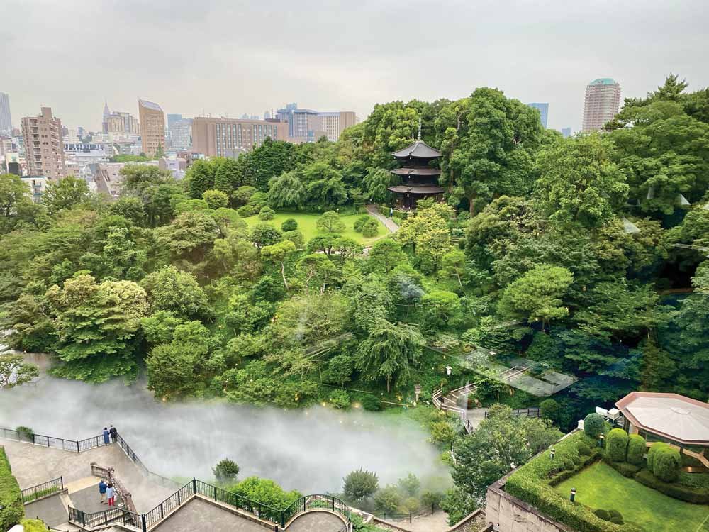 Mossy stone paths wind past trickling waterfalls and towering camphor trees, creating a dreamlike escape from Tokyo’s relentless energy. The glow of bamboo lanterns guides us to a three-storey pagoda, where we witness the nightly mist display that envelops the garden in a sea of clouds.