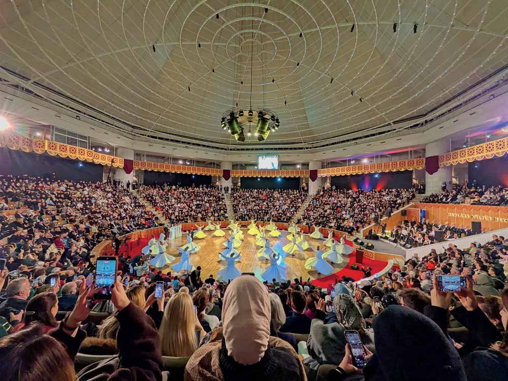 The final sensory experience occurs at the Sema ceremony. Part of the Şeb-i Arus commemoration, the “wedding night” marks the death anniversary of the mystic poet Rumi. Earlier, I paid respects at the Mevlana Museum, where his sarcophagus rests beneath a green-topped dome that seems to inhale and exhale with the faithful who file past.